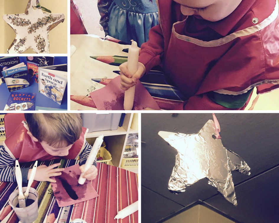 Following a trip to the library to find out about space, we made some fab stars to hang around the nursery and borrowed all sorts of space books for our interest table. We also had fun writing secret letters for the aliens, by creating marks on paper using wax candles. The children then revealed their messages using water based paints.